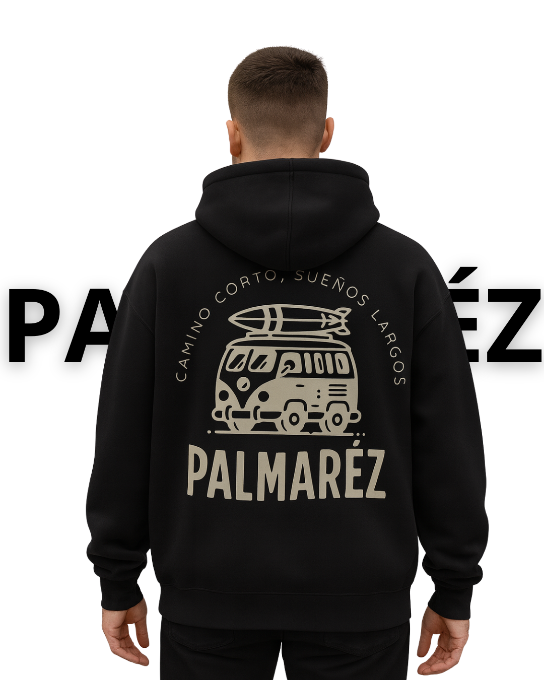Inspirada en la libertad del camino y los sueños que nos empujan, esta pieza combina diseño evocador con una confección premium pensada para durar. En la espalda, un estampado icónico: una furgoneta vintage con tabla de surf y el lema “Camino corto, sueños largos”. En el pecho, el sello PALMARÉZ en tipografía clara y moderna. Un homenaje al espíritu libre, al viaje, y a la identidad que nos une. Composición: 80% algodón cardado / 20% poliéster. Corte oversize con hombros caídos. Felpa perchada de tacto suave y cálido. Capucha forrada en algodón. Canalé 2×1 con acabado tubular en puños y bajo. Bolsillo oculto con cremallera invisible en el lateral derecho. Elastano en puños y bajo para evitar deformaciones. Tira cubrecosturas de espiga a tono y acabado de media luna en el interior del cuello. Doble pespunte en mangas y bajo para mayor resistencia. Una sudadera pensada para quienes viven con el corazón en la carretera y los sueños en el horizonte. PALMARÉZ viste tu viaje.
