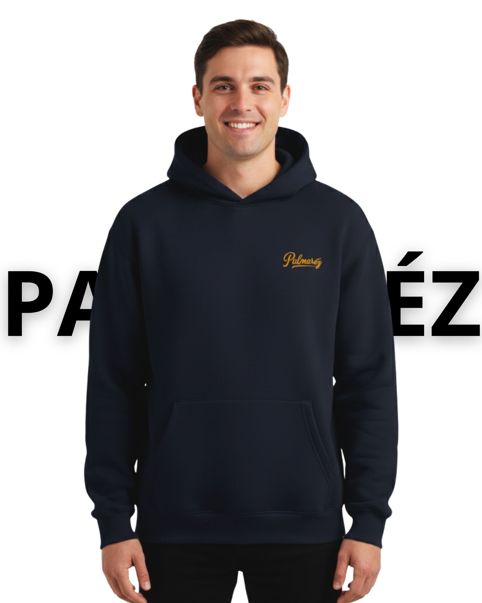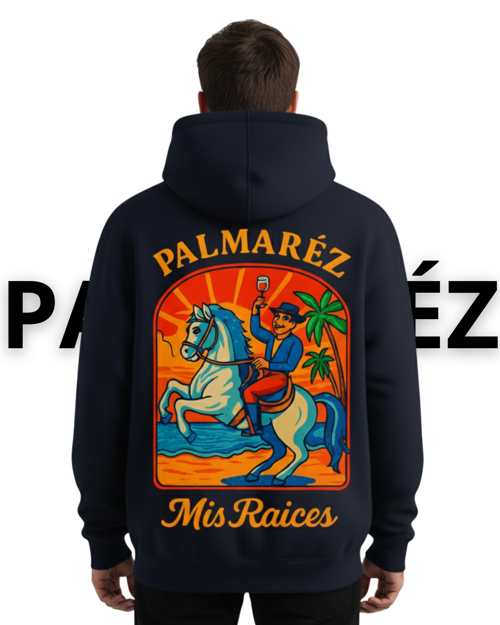 Sudadera azul marino navy con capucha y bolsillo tipo canguro confeccionada en tejido grueso y suave que aporta comodidad y abrigo en los días frescos. Detalle en el pecho con la palabra Palmarez en amarillo naranjado cursivo que transmite elegancia y orgullo, diseño trasero a gran formato con ilustración vibrante de un jinete levantando una copa de vino de Jerez sobre un caballo blanco atravesando aguas al atardecer acompañado de palmeras, rayos naranjas y el lema Mis Raíces en tipografía cursiva que refuerza la conexión con la tierra y la identidad cultural. Corte oversize con acabados de calidad en puños y cintura que garantizan ajuste perfecto y durabilidad una prenda que combina estilo urbano, tradición y un mensaje de pertenencia ideal para quienes desean vestir con personalidad y raíces.